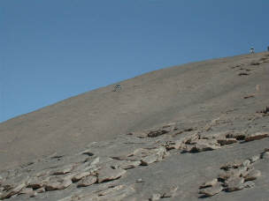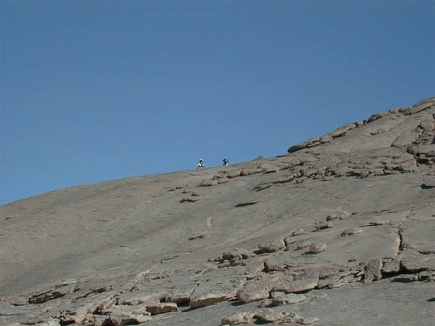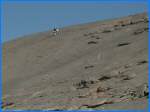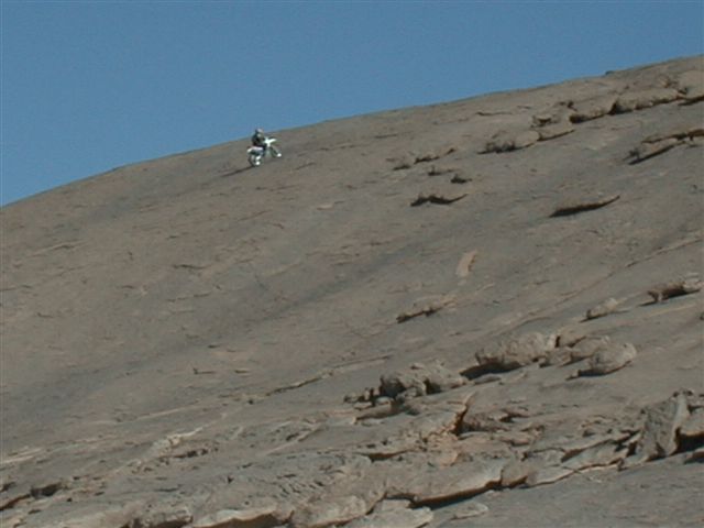 Als erstes versuchte ich die anderen davon abzuhalten, mir es gleichzutun: Aber 2 waren bereits auf der Strecke, die andern schauten ehrfürchtig, mit Betonung auf fu(e)rcht-ig, zu und waren sich noch ganz und gar nicht sicher, ob dies nun eine gute Idee ist oder wohl nicht! Noch höher hinauf zu fahren - was bestimmt verlockend gewesen wäre, aber: Hosenscheisser! - kam nicht mehr in Betracht und so entwarf ich die Strategie, die ich in einem Moto aktiv-Instruktoren-Kurs in Belgien gelernt hatte: Bei abgestelltem Motor, mit voller Konzentration aufs Vorderrad und die Kupplung als Hinterradbremse zu benützen, rollte ich fast stillstehend Meter um Meter den steilen Berg runter, wohl wissend, dass nichts, aber gar nichts schief gehen durfte. Sonst wäre die Wüstenreise wohl für mich und mein Töff definitiv beendet! Diese Minuten (hochfahren dauerte wohl weniger als eine volle Minute!) des Zitterns, der schieren Angst, nichts falsch zu machen, war die grosse Herausforderung und die Selbsterfahrung: Ein für einen kurzen Moment wegrutschendes Vorderrad, keine Kontrolle über die konzentriert zu haltende Geschwindigkeit - und schon hätte es das Aus bedeutet. Ich brauche wahrscheinlich nicht mehr auszuführen, wie wohl ich mich gefühlt hatte, als ich wieder als Erster unten war und wieviel ich mitgelitten hatte, bis es die andern beiden auch ohne Probleme zurückgeschafft hatten. Das Bild des letzten kurz vor dem Eintreffen an der Talsohle hatte ich selbst geschossen. Auch gibt es irgendwo noch einen Film davon...