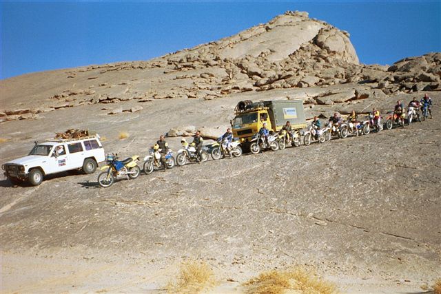 Das Problem des Felsens war, dass er, wie auf dem Bild, wo man das Gefälle etwa einschätzen kann, nicht sanft zum Wüstenboden verlief, sondern in einer praktisch senkrecht stehenden, etwa zwei Meter hohen Böschung. Diese konnte unmöglich im rechten Winkel angefahren werden. Die Herausforderung war gross und da ich diesbezüglich eher zur Kategorie der «Hosenscheisser» gehöre, Philipp - immer noch mit seinem Schlüsselbeinbruch beschäftigt - auch nicht als Vorreiter dienen konnte, lag es allein an mir, dieses Wagnis zu starten. Und da ich dank Dany Wirz, und natürlich vor allem dem besten Gelände-Instruktor Jens Scheffler, gelernt hatte, nie aufzugeben, musste es hier und jetzt unebdingt sein! Ich legte mir meine Strategie fest: Ich musste in grosser Geschwindigkeit in einer Kurve in die Steigung hineinfahren, um den Anpressdruck auf die Räder zu kriegen, um die praktisch senkrechte Böschung zu überwinden, um auf den Felsen zu gelangen! Aber auch dies hatte immer noch nichts mit der «Selbsterfahrung» zu tun...