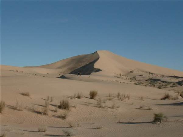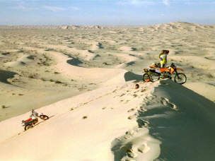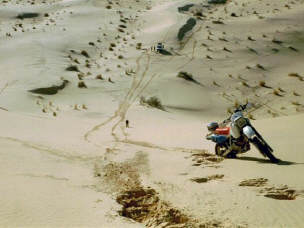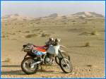 Ganz knapp am Tod vorbei: Das ist das Risiko eines jeden, der sich als Töfffahrer in die Wüste oder als Skifahrer neben die Piste begibt. Von einem auf den anderen Moment ist's mit der Euphorie vorbei, doch ich hatte Glück im Unglück! Es war eine relativ flache (was halt für Enduros so als flach gilt!) Wüste, sandig und mit Sträuchern gespickt: Am Fusse dieser Sträucher gibt es immer ein Häufchen Sand, das vom Wind hin-, aber wegen der Luftstörung durch den Strauch, nicht gleich weitergeblasen wird. Die Häufchen können je nach Strauchgrösse auch zu einem Haufen von einem halben Meter anwachsen. |