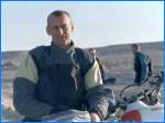 Als ich nun diese Düne vor mir sah und alle wie wild darauf zufuhren, wollte ich sie alle überholen, um von vorne die Ansicht der Gruppe, auf die Düne zufliegend, zu fotografieren. Also musste ich mein Tempo drastig steigern: Statt 80 km/h fuhr ich vielleicht 110, auf alle Fälle musste ich viel schneller fahren, wenn ich diesen Vorsprung für das Bild herausfahren wollte. Immer wieder kontrollierte ich meine Position gegenüber der Gruppe, schaute also wieder weg von meiner Fahrspur - und so geschah das Unvermeidliche: Da ich zur Seite und nicht vors Vorderrad geschaut hatte, erwischte ich einen Busch mit einem grossen Sandhaufen, was am Vorderrad dank grossem Federweg noch klappte, mir aber dann das Hinterteil der Maschine in die Luft katapultierte. Ich sah plötzlich keinen Horizont mehr, nach einem gewaltigen Schlag in den Hintern überschlug sich die Maschine und landete kopfüber neben mir im Sand, und dies bei sehr hohem Tempo! Als ich wieder zu mir kam, schüttelte ich meinen Kopf, stand unter grossen Brustschmerzen auf und weitherum war nichts mehr zu sehen. Glücklicherweise konnte der Landcruiser das Tempo der Motorräder nicht halten und kam so verspätet an die Unfallstelle. Wenn in einer flachen Wüste jemand steht, sieht man das von weit weg: Das wurde mir nun zum Glück, denn keiner aus der rasenden Truppe hatte meinen Sturz bemerkt und wahrscheinlich hätte erst am Ziel meine Frau Luzia dann vergeblich gesucht. Jemanden, der bewusstlos irgendwo liegt, wieder zu finden, ist dann wie eine Stecknadel im Heuhaufen. Denn 15 Motorräder machen einen Haufen Spuren und, wenn sie in der Breite über Hunderte von Metern verteilt sind, ist das eine endlose Arbeit, auf Spurensuche zu gehen. Man hätte bestimmt bis zum Punkt zurückfahren müssen, wo wir uns das letzte Mal versammelt hatten. |