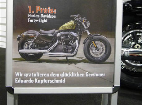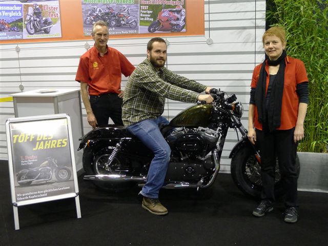 Der glückliche Gewinner des Hauptpreises, Edi Kupferschmid, Fahrschüler von mir, der das «Töff»-Magazin anlässlich der Weihnachtseinladung 2012 mit genommen hat, mit seiner Harley-Sportster Forty-Eight, kurz nach Preisübergabe. Der Wettbewerb war anlässlich der «Wahl des Motorrad des Jahres» ausgeschrieben. Zu mehr Bildern aufs Bild klicken!
