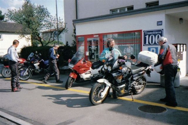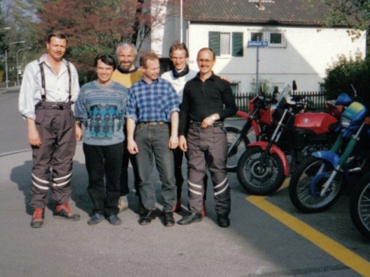 Im Mai 1993 trafen sich die Herren v.l.n.r. Toni Kalberer, Bruno Kneubühler, Bruno Langenegger, Andy Nauli, Urs Tobler und Hanspeter Krieg an der Tramstrasse, um offiziell die Prüfung zum Instruktor des Verkehrssicherheitsrates abzulegen. Sie bestand aus einem schriftlichen und einem mündlichen Teil, sowie einer «Fahrprüfung» auf einer Maschine mit dem Töff-Profi Küre Werren aus Bern auf dem Sozius, dahinter im Schlepptau Hubert Schalbetter auf Küre's Africa Twin. |